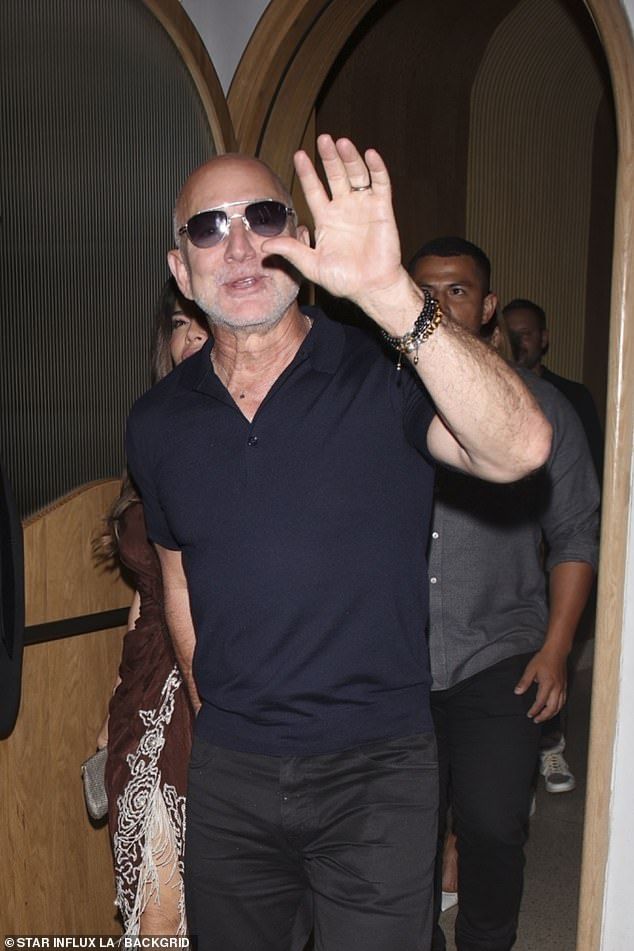 The couple were seen beaming from ear to ear as Jeff, who rocked a navy blue polo shirt, black trousers, and blue lens sunglasses, led the two of them out of the restaurant and through the crowd of photographers