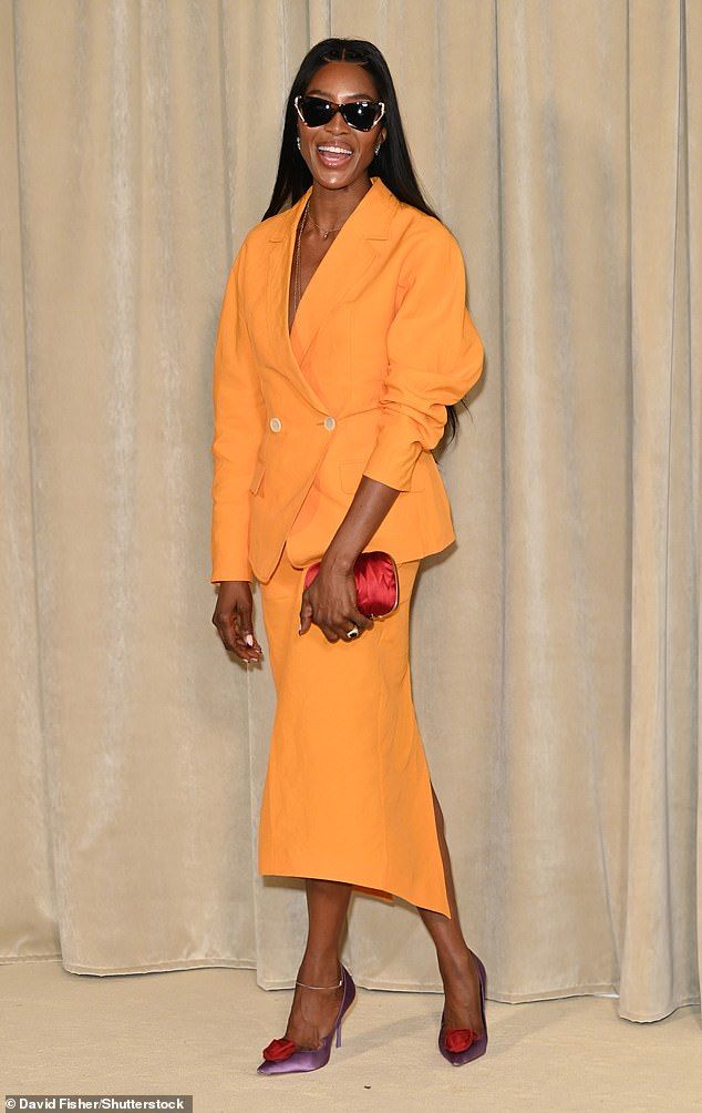 Supermodel Naomi, 55, looked chic in a bright orange two-piece suit, which featured a midi-length skirt and padded 80s-inspired sleeves